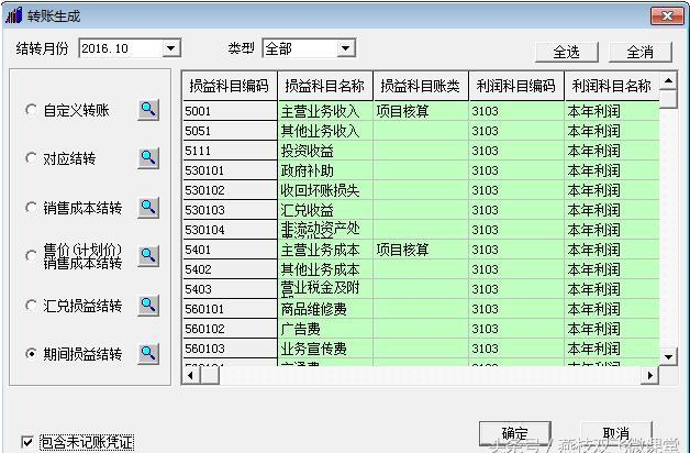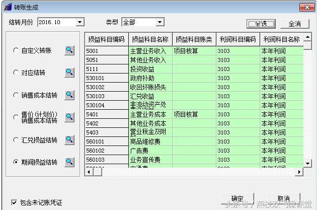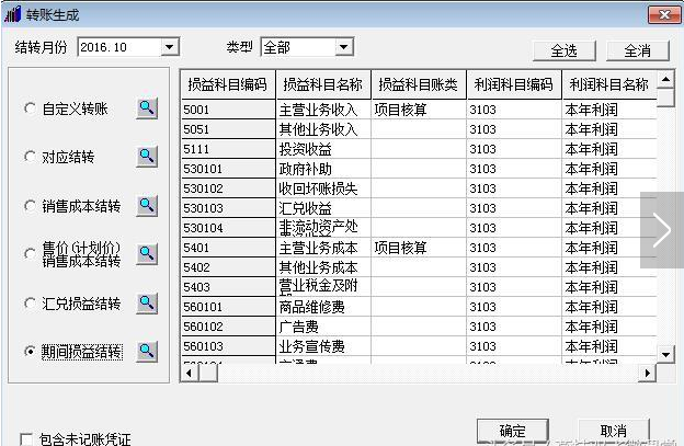 七、如要对损益类部分科目进行结转,可在转账生成中单独选中要结转的科目;如要对损益类所有科目进行结转,可在转账生成中点击全选。