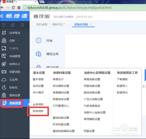 打开软件,在界面左侧的菜单栏中选择“系统管理”,点击“期末处理”中的“财务结账”。