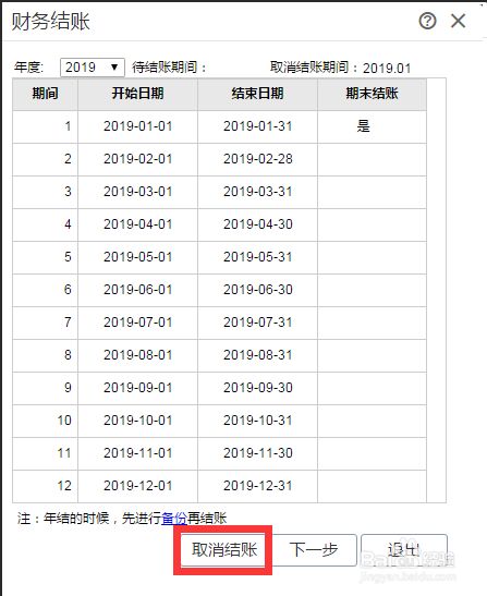 在打开的“财务结账”界面,显示本年度所有的会计期间,点击下方的“取消结账”按钮,即可完成反结账操作。