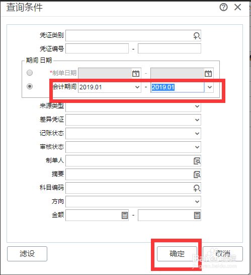 在软件首页左侧菜单栏,选择“总账”,点击“凭证管理”,进入“凭证管理”的“查询条件”界面,选择“会计期间”等查询条件,点击“确定”按钮进行查询。