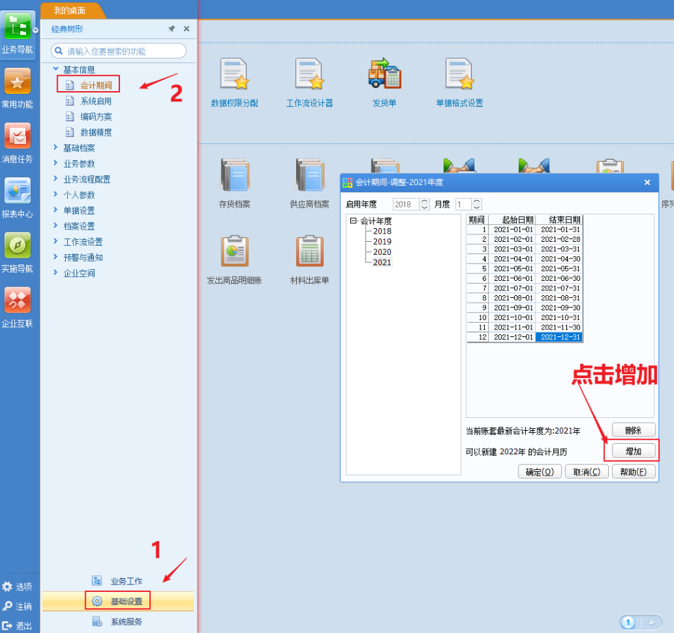 2)系统自动新建:除出纳模块外,其他任一模块12月结账,系统都会自动新建新年度会计期间。