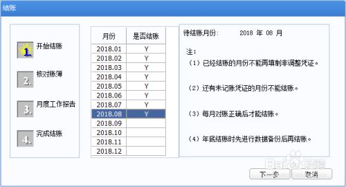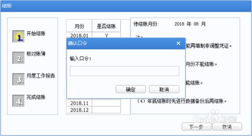 输入密码口令后,2018年8月份对应的“Y”消失,反结账成功!点击“取消”按钮,退出结账窗口。