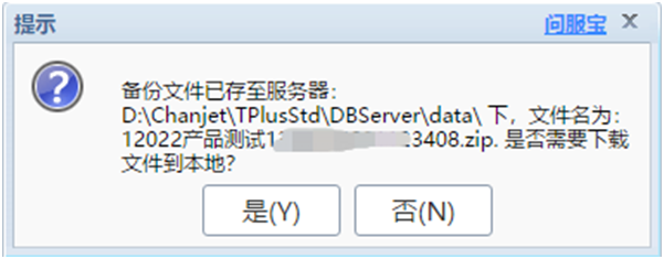 3、备份成功后文件会保存到指定的服务器路径,同时会提示是否需要下载文件到本地,如果在服务器上备份则可选“否”,若在客户端进行备份操作则可选“是”,把备份文件下载到本地的电脑,实现异机二重备份。(PS.备份完成后亦可将备份文件拷贝到U盘或上传网盘,进行多重备份保障)