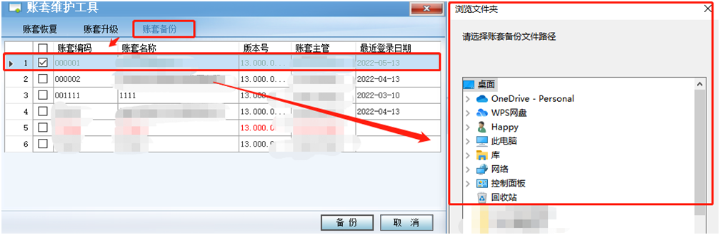 2、选择【账套备份】后,可以批量勾选所需备份的账套明细,点击下方【备份】按钮,在弹出的【浏览文件夹】小窗中指定备份存储的路径点击【确定】即可开始备份。