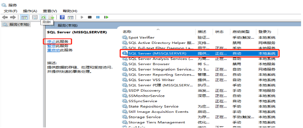 点击【开始】—【控制面板】—【管理工具】—【服务】,找到数据库服务SQL Server(MSSQLSERVER),点击右键,将服务停止。