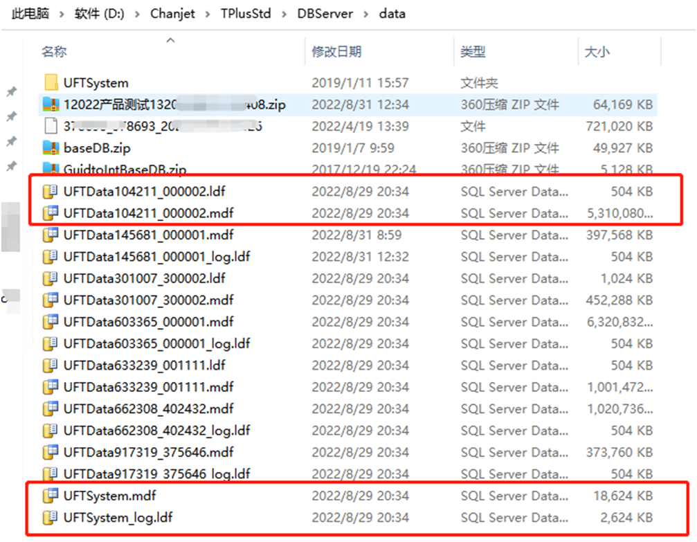 2、进入软件安装路径的data文件夹(X:\Chanjet\TPlusStd\DBServer\data)下,找到*.mdf和*.ldf的账套库物理文件和系统库物理文件,如下图,在数据库服务停止之后将这些文件备份好,或者可以直接把data文件夹进行备份。