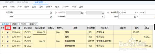 进入“凭证管理”查询结果的界面,选择需要反记账的凭证,勾上“序号”前的方框,选择所有凭证。
