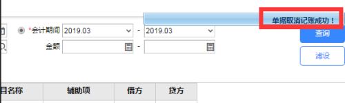 在当前界面的右上角出现“单据取消记账成功!”的提示信息,表示所选的凭证反记账成功。