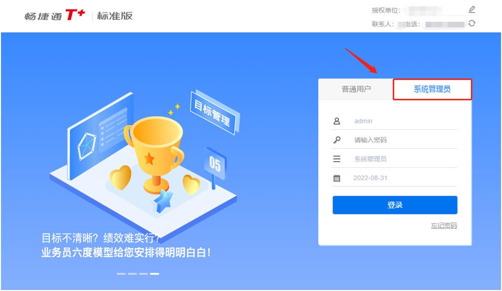 1、运行T+至登录首界面,选择【系统管理员】进行登录。